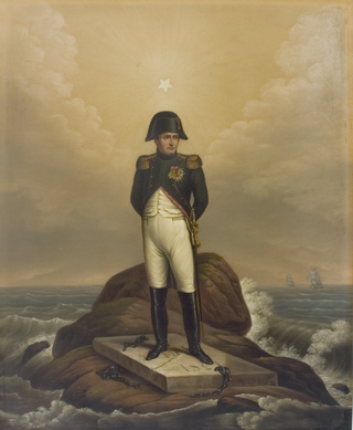Gemälde mit Glorifizierung Napoleons im Exil auf St. Helena (1815-1825). Der ehemalige französische Kaiser mit auf dem Rücken verschränkten Armen in Uniform, Zweispitz und Orden in majestätischer Haltung auf einer Steinplatte stehend. Steinplatte mit gesprengten Ketten und gravierter Inschrift "Mai 1821" auf einem aus den schäumenden Wellen herausragenden Fels im Meer. Im Hintergrund das Meer mit zwei Segelschiffen mit geblähten Segeln. Im Himmel ein sich direkt über Napoleon teilendes Wolkenband, in dessen Mitte sich ein Stern zeigt, der in alle Himmelsrichtungen strahlt.
