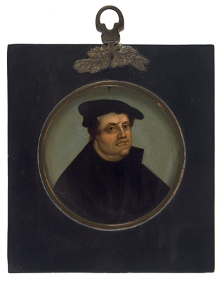 Rundes Miniaturgemälde mit Bildnis des Reformators Martin Luther (1483-1546) mit Barett und dunklem Mantel. Neutraler Hintergrund. Originaler Papiermaché-Rahmen mit Aufhänger aus vergoldetem Metall.