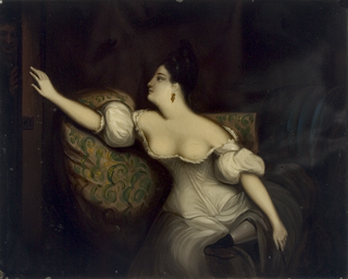 Rechteckiges Gemälde mit junger Frau mit tiefem Dekolleté und ihrem Liebhaber im Separée, den sie vor den Blicken des Hausherrn, der durch den Türspalt blickt, zu verbergen versucht.