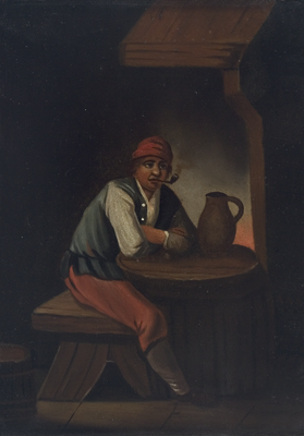 Rechteckiges Miniaturgemälde mit einem am Bauerntisch sitzenden, Pfeife rauchenden Niederländer mit Bierkrug. Anmerkung: Ungewöhnlich grobe Malerei.