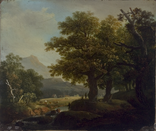Rechteckiges Miniaturgemälde mit typischer Vorharzlandschaft im Stil des Pascha Johann Friedrich Weitsch (1723-1803). Im Vordergrund mächtige Eichbäume, Flüsschen mit Wasserfall und Angler sowie weitere Figuren- und Tierstaffage. Im Hintergrund Häuser und Berge. Malerei von Thorstein Illugason Hjaltalin (1771-1817) einem Schüler des P. J. F. Weitsch.