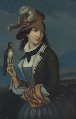 Rechteckiges Miniaturgemälde mit junger Falknerin im Jagdkostüm, mit Straußenfedern und Rosen am Hut, Halstuch und Ärmelschutz am linken Arm. In der rechten Hand ein auf ihrem Handschuh sitzender Falke. Im Hintergrund schroffe Bergkette.