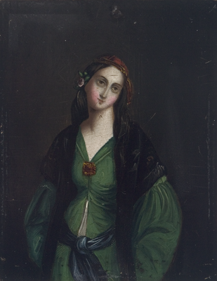 Rechteckiges Miniaturgemälde mit junger Orientalin mit gebundenem Kopftuch und Rose im Haar, über die Schulter gelegter Stola, Brosche am Kleidausschnitt und gebundenem Hüfttuch. Neutraler, dunkler Hintergrund.
