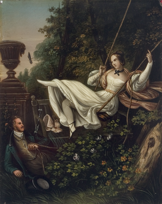 Rechteckiges Miniaturgemälde mit junger Frau im Biedermeierkleid mit wehendem Kleiderrock in einer Schaukel im Park. Am Boden ein unter ihr liegender Mann mit abgelegtem Zylinder, der ihr unter den Rock blickt. Links Steinpodest mit Gartenvase und durch die Luft fliegender Damenschuh.