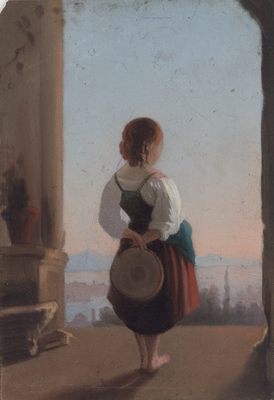 Rechteckiges Miniaturgemälde mit kleinem Mädchen mit Strohhut in Händen und bäuerlicher Kleidung. Die Dargestellte in Rückenansicht auf einem Steinplateau beim Blicken in die unter ihr liegende Landschaft. Links zwei Säulen und ein Blumentopf auf Steinsockel .