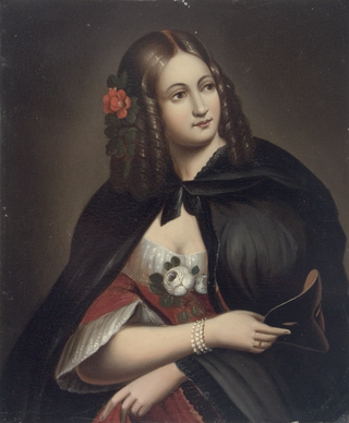 Rechteckiges Gemälde mit Bildnis der Opernsängerin Wilhelmine Schröder-Devrient (1804-1860), vermutlich im Kostüm der Donna Anna aus Mozarts Oper "Don Giovanni". Die Dargestellte mit Schillerlocken mit Blumen, Maske in der Hand und schwarzem Umhang über ihrem Festkleid, das mit Rosen am Ausschnitt geschmückt ist. Malerei nach einer Vorlage von Adolf Henning (1809-1900).