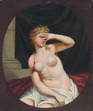 Rechteckiges Miniaturgemälde. Im Oval: Junge, nur mit Hüfttuch bekleidete, auf dem Ruhelager sitzende Frau, die ihren Blick schamhaft mit der Hand verbirgt. Im Hintergrund Säule und geraffter Vorhang.
