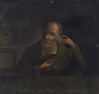 Rechteckiges Miniaturgemälde mit bärtigem Uhrmacher am Arbeitstisch mit Taschenuhr am Ohr. Am Tisch Uhrmacherwerkzeug; im Hintergrund Kommode mit Tischuhr.