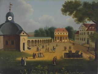 Rechteckiges Gemälde mit unbekanntem Ortsplatz Platz mit Personen- und Tierstaffage. Links ein Kirchenrundbau mit plastischer Turmuhr, Galerie und Gutshäuser. Im Vordergrund Rasenfläche mit Blumen. Anmerkung: Bildplatten mit eingesetzten Uhren werden auch als "Bilderuhren" bezeichnet.