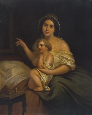 Rechteckiges Gemälde mit junger, auf dem Bett sitzender Mutter mit ihrem, in ein Tuch gehüllten, kleinen, betenden Knaben. Im Vordergrund Nachttischchen mit Schmuckkästchen und Glöckchen.