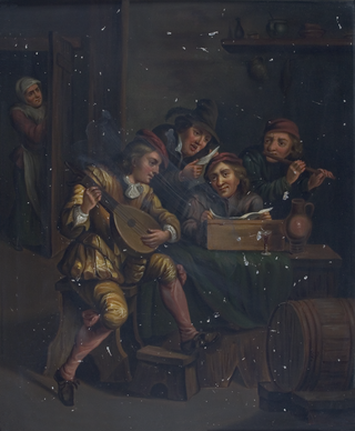 Rechteckiges Gemälde mit vier fröhlichen, niederländischen Musikanten in einer Bauernstube. Im Hintergrund belauscht von einer Bäuerin in halbgeöffneter Tür. Malerei im Stil des David Teniers (1610-1690).