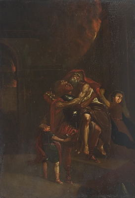 Rechteckiges, beidseitig bemaltes Gemälde (vermutlich Einsatz für einen Kaminschirm oder Paravent). Heroische Szene mit altem, nur mit Tüchern bekleidetem Mann, der von einem römischen Soldaten von einem Podest gerettet wird. Neben beiden eine die Hände ringende Frau sowie ein Kind. Im Hintergrund brennender Tempel (vermutlich das brennende Rom). Rückseite des Gemäldes mit junger Römerin mit fließendem Gewand auf einem Rasensockel.