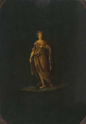 Rechteckiges, beidseitig bemaltes Gemälde (vermutlich Einsatz für einen Kaminschirm oder Paravent). Junge Römerin mit fließendem Gewand auf einem Rasensockel. Auf der Rückseite des Gemäldes: Heroische Szene mit altem, nur mit Tüchern bekleidetem Mann, der von einem römischen Soldaten von einem Podest gerettet wird. Neben beiden eine die Hände ringende Frau sowie ein Kind. Im Hintergrund brennender Tempel (vermutlich das brennende Rom).