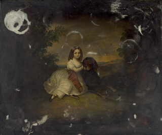 Rechteckiges Gemälde (vermutlich Metalleinsatzbild für ein Tischchen). Kleines, auf dem Rasen sitzendes Mädchen mit "Schillerlocken" im Festtagskleid mit üppiger Schärpe und großer, neben ihr liegender Hund. Rechts und links Buschwerk; im Hintergrund weite Landschaft.
