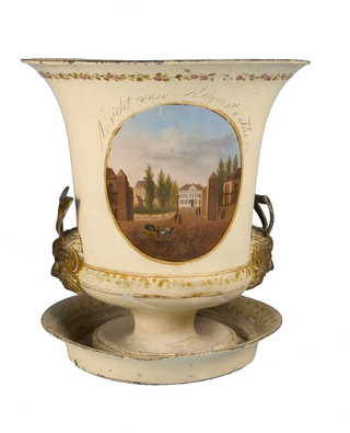 Kratervase (von einem Paar) mit Untersatz, elfenbeinfarben lackiert. Handhaben aus gegossenen, vergoldeten Satyrköpfen mit Henkeln. Dekor mit goldfarbenen Blatt- und Blütenornamenten sowie Linien. Auf Vorder- und Rückseite Ovalmedaillons mit Braunschweiger Statansichten. Rückseite: Stadtplatz mit dem Braunschweiger Augusttor. Personenstaffage und Kutsche im Vordergrund. Im Hintergrund Bürgerhäuser, Bäume und Büsche. Darüber in Schreibschrift Bezeichnung "Ansicht von August=Thor".