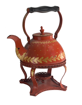 Teekessel mit Rechaud, Weißblech, rot lackiert, Holzgriff schwarz lackiert. Auf Deckel und Kessel umlaufender, goldfarbener Blattfries und Sternchen. Auf der Tülle und dem Rechaud Blattornamente.