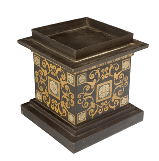Würfelförmiges Piedestal (Aufsatz fehlt) aus Weißblech auf getrepptem Sockel, dunkelbraun lackiert. Auf den vier Seitenflächen mit Blüten in quadratischen Feldern sowie goldfarbenen Arabesken dekoriert.