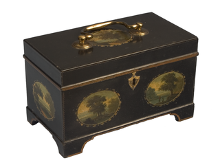Rechteckige Schatulle (Teekasten) mit drei Teedosen im Innern. Schwarz lackiert, Schlüsselschild aus vergoldetem Metall. Tragegriff aus vergoldeter Bronze. Auf dem Deckel, den Seitenflächen und der Rückseite jeweils ein mit Blättern umranktes Ovalmedaillon mit Landschaftsdarstellungen mit Eichbäumen im Stil des Pascha Johann Friedrich Weitsch (1723-1803). Auf der Frontfläche zwei Medaillons in gleichem Stil. Im Innern kastenförmige Teedose mit Ovalmedaillons auf Vorder-, Seiten-, Rück- und Deckelfläche sowie zwei weitere Teedosen mit Steckdeckel und Ovalmedaillons auf Vorder- und Rückseite. An den Kastenrändern glatte, gemalte Goldleisten bzw. goldfarbene Wellenlinien. Anmerkung: Der Schatulle sind die Dosen "Teedose mit Landschaften" zugehörig.