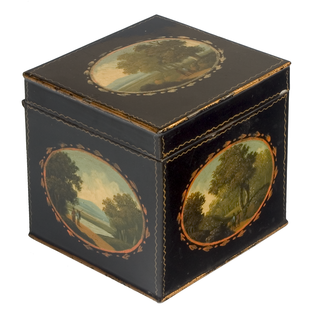Rechteckige Teedosen in Würfelform, schwarz lackiert. Auf dem Deckel, den Seitenflächen und der Rückseite jeweils ein mit Blättern umranktes Ovalmedaillon mit Landschaftsdarstellungen mit Eichbäumen im Stil des Pascha Johann Friedrich Weitsch (1723-1803). An den Kastenrändern glatte, gemalte Goldleisten bzw. goldfarbene Wellenlinien. Anmerkung: Die Dose ist der Schatulle "Landschaften in Ovalen" zugehörig.