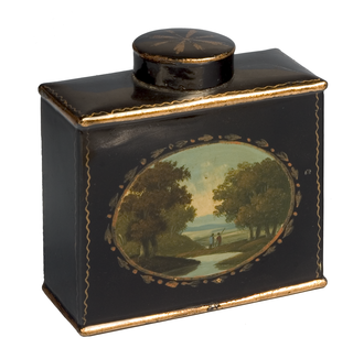 Rechteckige Teedose mit Steckdeckel, schwarz lackiert (von einem Paar). Auf der Vorder- und Rückseite jeweils ein mit Blättern umranktes Ovalmedaillon mit Landschaftsdarstellungen mit Eichbäumen im Stil des Pascha Johann Friedrich Weitsch (1723-1803). An den Kastenrändern glatte, gemalte Goldleisten bzw. goldfarbene Wellenlinien. Auf dem Steckdeckel goldfarbener Stern. Anmerkung: Die Dosen sind der Schatulle "Landschaften in Ovalen" zugehörig.