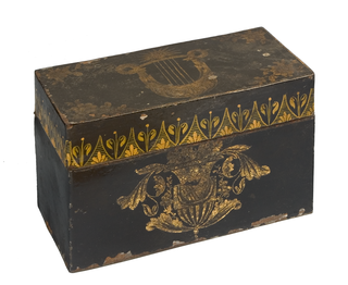Rechteckige Schatulle, schwarz lackiert. Rundum Goldborte mit Blattdekor. Auf der Frontfläche: Goldfarbener Blumenkorb und Blattornamente; im Zentrum des Deckels Lyra und Blumen; in den Deckelecken Blumen und Blätter.