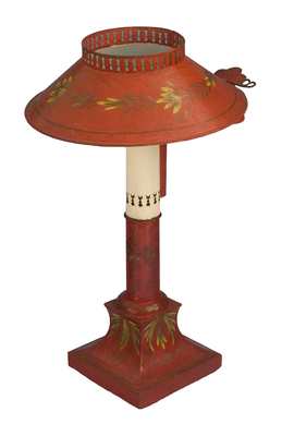 Leselampe auf quadratischem Fuß, rot und weiß lackiert. Dekor mit goldfarbenem Blätterfries auf Standfuß und Schirm.