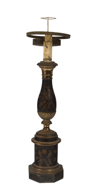 Lampenfuß, dunkelbraun lackiert. Achtecksockel, Rundsockel und Schaft dunkelbraun lackiert; rundum mit graphischen Ornamenten, Blüten und Blättern dekoriert. Zierringe an Sockel und Balusterschaft sowie Schirmreif aus Messing. Brennvorrichtung mit gestanzten Luftschlitzen aus Zinn, elfenbeinfarben lackiert. Anmerkung: Den Rohling des Lampenfußes fertigte vermutlich die Braunschweiger Fabrik von "C. Bammel"; die Dekoration besorgte dann eines der Braunschweiger Lackunternehmen (Kraegelius, Evers oder Stobwasser).