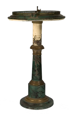 Lampenfuß. Rundsockel und Schaft mit Malachitimitation lackiert. Zierringe an Sockel und Balusterschaft aus Messing. Schirmreif mit Malachitimitation bzw. elfenbeinfarben lackiert. Brennvorrichtung mit gestanzten Luftschlitzen aus Zinn ebenfalls elfenbeinfarben. Anmerkung: Den Rohling des Lampenfußes fertigte die Braunschweiger Fabrik von "C. Bammel"; die Dekoration besorgte dann eines der Braunschweiger Lackunternehmen (Kraegelius, Evers oder Stobwasser).