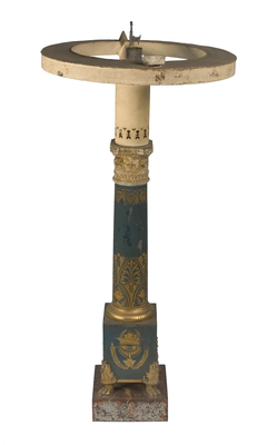 Lampenfuß auf quadratischer Plinthe. Quadratischer Sockel (mit gegossenen, vergoldeten Löwenklauen) sowie runder Schaft in Säulenform aus Weißblech. Kapitell aus vergoldetem Zinkguß. Brennvorrichtung mit gestanzten Luftschlitzen und Schirmring elfenbeinfarben. Plinthe mit Steinimitation; Sockel und Schaft grün lackiert. Dekoriert mit goldfarbenen Fruchtkörben, Palmetten und Floralornamenten. Anmerkung: Den Rohling des Lampenfußes fertigte vermutlich die Braunschweiger Fabrik von "C. Bammel"; die Dekoration besorgte dann das Braunschweiger Lackunternehmen Stobwasser.