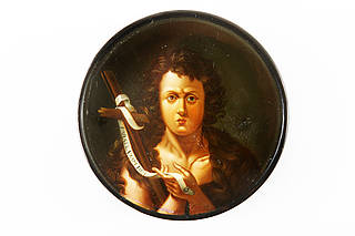 Runde Dose mit Bildnis Johannes des Täufers mit Pelz und Kreuz mit beschrifteter Banderole (darauf:" PARATEVIAM DEI" (Bereite den Weg zu Gott). Neutraler, nach unten hin aufgehellter Hintergrund.
