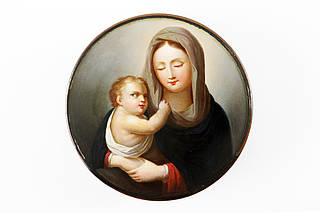 Runde Dose mit Bildnis der Muttergottes mit Jesusknaben. Hintergrund nach oben hin aufgehellt. Malerei vermutlich nach einer Vorlage des Malers Tiziano Vecellio, gen. Tizian (wohl 1477-1576).