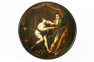 Rechteckige Dose mit einer Interieurszene aus dem Alten Testament. König Pothiphars Weib versucht, den fliehenden Joseph in ihr Schlafgemach zu ziehen und ihn zu überreden, sich zu ihr zu legen.