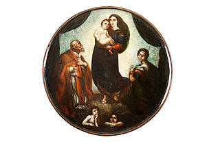 Runde Dose aus Papiermaché mit eingelegter Metallplatte mit Malerei. Die "Sixtinische Madonna" inmitten eines geöffneten Vorhangs im mit Puttenköpfen gefüllten Wolkenhimmel, flankiert von Papst Sixtus II. (1414-1484) und der Heiligen Barbara. Am unteren Bildrand zwei geflügelte Puttenfiguren. Malerei nach Raffaelo Santi, gen. Raffael (1483-1520). Anmerkung: In Papiermachédosen eingearbeitete Metallplatten sind selten. Das Originalgemälde befindet sich in der Gemäldegalerie in Dresden.