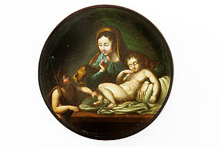 Runde Dose mit Maria und dem, auf einem Podest in Tüchern liegenden, schlafenden Christuskind, das der Johannesknabe wecken will. Maria mahnt jedoch mit vor dem Mund gehaltenen Finger zur Stille. Neutraler, dunkler Hintergrund.