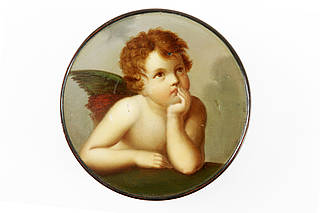 Runde Dose mit einem sich auf einer Mauerbrüstung auflehnenden, das Kinn auf die linke Hand stützenden, unbekleideten, geflügelten Putto. Malerei nach dem Gemälde "Die Sixtinische Madonna" von Raffaelo Santi, genannt Raffael (1483-1520). Wolkenhintergrund. Anmerkung: Das Gemälde befindet sich in der Gemäldegalerie in Dresden.