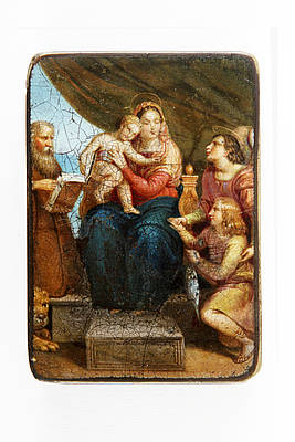 Rechteckige Dose mit Maria und dem Christusknaben auf dem Thron, St. Markus mit geöffnetem Buch und Löwen sowie zwei Engeln, die der Gottesmutter einen Fisch (Symbol für den christlichen Glauben) reichen. Im Hintergrund zur Seite geraffter Vorhang und Blick ins Freie. Malerei nach einer Vorlage von Raffaelo Santi, genannt Raffael (1483- 1520).