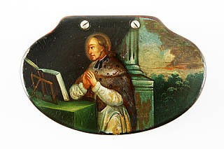 Muschelförmige Dose mit vor aufgeschlagenem Buch betenden Pilger bzw. Kirchenfürsten im Hermelin im Freien. Hintergrund mit zur Seite gerafftem Vorhang, Piedestal mit Säule und Blick in eine Baumlandschaft sowie auf einen Himmel mit dramatischer Wolkenbildung.