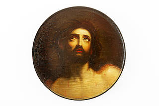 Runder Schnupftabaksdosen-Deckel (Boden verschollen) mit Bildnis Christi mit Dornenkrone. Neutraler, von hinten aufgehellter Hintergrund. Malerei nach einer Vorlage von Guido Reni (1575-1642).