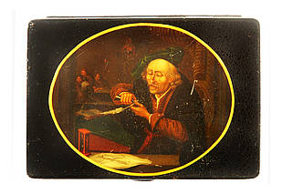 Rechteckige Dose, schwarz lackiert. In goldfarben gerahmtem Ovalmedaillon: Älterer Niederländer mit Samtbarett am Schreibpult, beim Anspitzen einer Schreibfeder. Vor ihm auf dem Tisch verschiedene Utensilien und eine Sanduhr; im Hintergrund eine Wirtsstube mit angeregter Tischgesellschaft sowie der Wirt beim Servieren. Malerei nach einer Stichvorlage von Albert Henry Payne nach dem Gemälde von von Gerard Dou (1613-1675).
