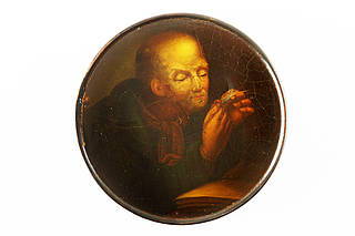 Runde Dose mit älterem Mann beim Schneiden seiner Schreibfeder am Schreibpult. Dunkler, neutraler Hintergrund. Malerei nach einer Vorlage von Gerard Dou (1613-1675).