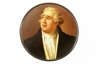 Runde Dose mit Bildnis eines unbekannten Herrn mit welligem Haar, Halsbinde mit Rüschenjabot, Weste und dunklem Rock. Neutraler, rechts leicht aufgehellter Hintergrund. Anmerkung: Bei der Malerei auf dieser Dose handelt es sich sehr wahrscheinlich um eine Auftragsarbeit "nach der Natur".