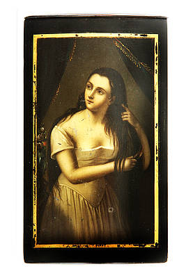 Rechteckiges Zigarrenetui, schwarz lackiert. In schmaler Goldrahmung: Sich kämmende, junge Frau im Unterkleid bei der Morgentoilette. Im Hintergrund ein Blumenstrauß sowie ein zu beiden Seiten geraffter Vorhang mit Fransenborte.