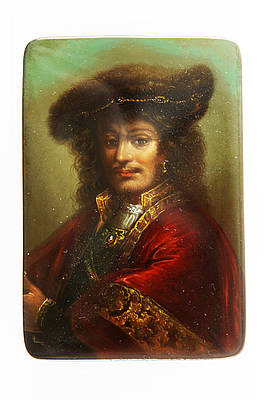 Rechteckige Dose mit Bildnis eines niederländischen Bürgermeisters mit Pelzkappe mit Edelsteinen, Ohrring sowie reich verziertem Ornat. Malerei nach einer Vorlage von Rembrandt Haremsz van Rijn (1606-1669).