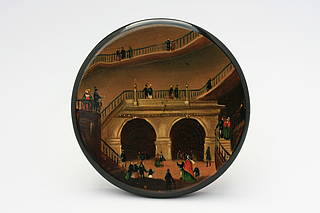 Runde Dose mit Blick in eine große Halle mit zweistöckigem Treppenhaus. Zahlreiche Personenstaffage mit Personen in Kleidung der Biedermeierzeit.