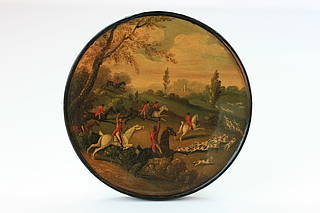 Ungewöhnlich große, runde Dose mit abschraubbaren, doppelten Böden. Auf dem Deckel: Landschaft mit größerer Jagdgesellschaft mit einer Hundemeute auf der Hirschjagd. Im Hintergrund Hügellandschaft mit Burg. Im Deckel: Falknerin mit Falken auf der Hand mit zwei Jagdgehilfen mit Falken und Jagdhund. Am Himmel drei davonfliegende Reiher. Im Boden: Junge, festlich gekleidete Frau an Steinsims mit liegendem Löwen beim Betrachten eines Bootes mit zwei Personen mit brennender Fackel auf einem See. Neben ihr eine Laute mit Schleifenband. Im Himmel aufgehender Mond.