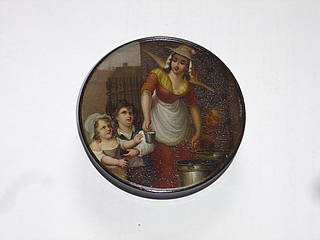 Runde Dose mit einer jungen Frau mit Joch auf der Schulter, die drei Kindern vor dem Haus mit einer Kelle Milch aus großen Eimern schöpft und ihnen diese im Metallbecher anbietet. Im Hintergrund ein Eisenzaun und Häuser. Malerei nach dem Gemälde "Milk Below Maids" von Francis Wheatley (1747-1801).