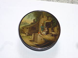 Runde Dose mit einer Szene vor einem niederländischen Bauernhaus. Die vor der Haustür sitzende junge Mutter mit Spinnrocken bei der Unterhaltung mit einem rastenden Mann. Am Boden sitzend ein kleines Kind. Im Hintergrund ein an das Haus angebauter Stall mit zwei Schweinen davor. Malerei nach einer Vorlage von Adriaen van Ostade (1610-1684).