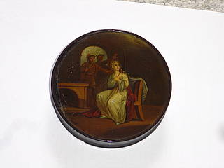 Runde Dose mit einer Freitodszene nach der römischen Sage. Die auf einem Stuhl sitzende, schöne und tugendhafte Lucretia, Gattin des Lucius Tarquinius Collatinus, die mit ihren Händen ein langes Messer umklammert, mit dem sie sich nach ihrer Entehrung durch Sextus Tarquinius erdolchen wird. Im halbrunden Türrahmen zwei herbeieilende Männer mit erhobenen Schwertern.