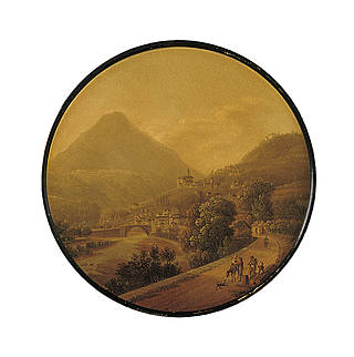Miniaturgemälde aus einem Zyklus von 24 Rundbildern im Originalpassepartout mit der Bezeichnung "La grande Rue de Simplon" (Die große Straße des Simplon) im Schweizer Kanton Wallis, einem Alpenpaß zwischen den Walliser und Tessiner Alpen, der das Rhonetal mit dem Tal der Toce verbindet. Blick auf eine Ortschaft mit Kirche, Fluß und Brücke an der Simplonstraße. Auf der Straße Personen- und Tierstaffage. Im Hintergrund hoher, spitzer Berg. Malerei nach Vorlagen von Vater Gabriel Lory (1763-1840) und Sohn Mathias Gabriel Lory (1784-1846). Bezeichnung der Darstellung in kursiver, schwarzer Schreibschrift unter dem Rundbild auf dem vergoldeten Metallpassepartout.