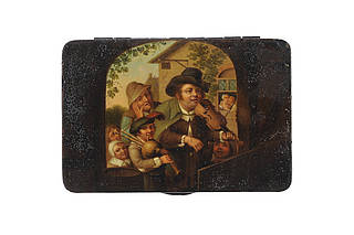 Rechteckige Dose, schwarz lackiert. In oben abgerundetem, mit Weinlaub bewachsenen Tor: Musizierende Niederländer mit Geige und Dudelsack sowie einige Zuhörer. Im Hintergrund Haus mit Liebespaar im Fenster. Malerei nach einer Vorlage von Christian Wilhelm Ernst Dietrich, gen. Ditricy (1712-1774).